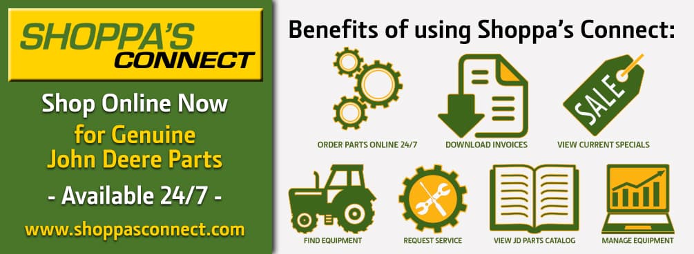 If you own a piece of John Deere equipment, you need an account on Shoppa's Connect! Look up and order parts online 24/7, schedule service, download invoices and more from a computer or on your phone with our brand new Shoppa's Connect app!