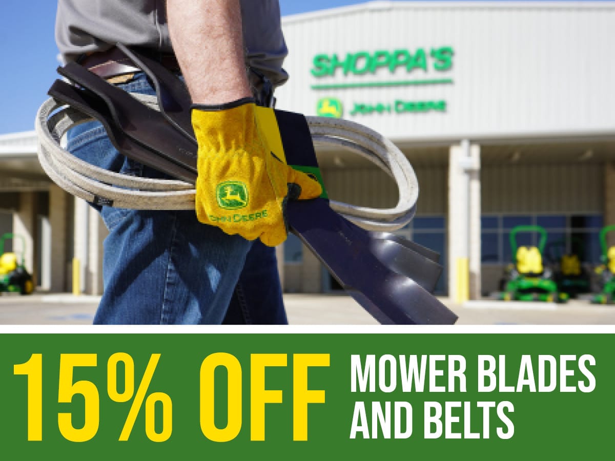 Get 15% off blades and belts for your John Deere riding lawn mower at Shoppa’s! Valid through April 30. Contact your local Shoppa’s parts experts for details.